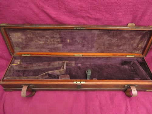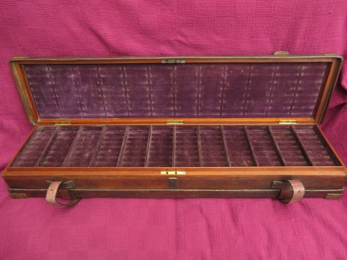 271416 Very rare double sided mahogany and leather gun case, possibly built for Live Pigeon shooting: blocked for a single hammerless gun with 30 barrels and 17 Ό breech to heel. Opposite side takes up to 96 x 12b cartridges. Lined in purple velvet with new handle and captive straps. This case is of the highest quality and is a must for someone with the appropriate gun to go inside!