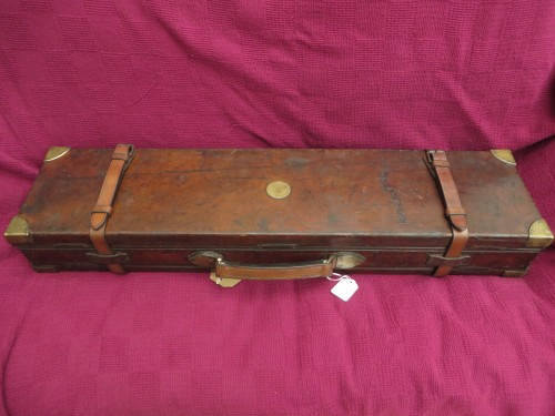 101126 Westley Richards single leather hammergun case. Original green baize lining with full complement of labels. Blocked for 30 barrels and 18 breech to butt. In need of some restitching to the lid corners.