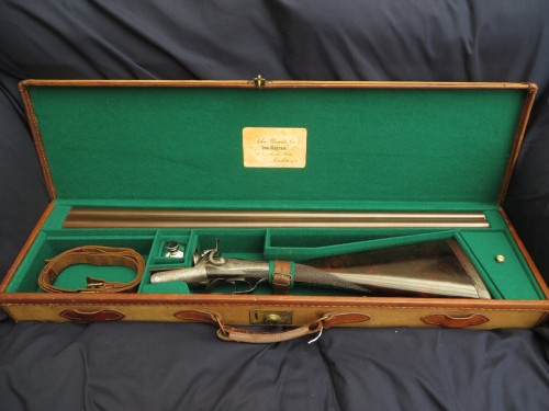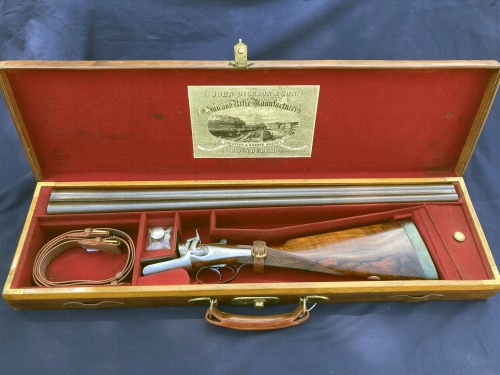 1870’s J Blanch & Son 12b Thumblever Hammergun, 29” x 2 ¾” nitro damascus barrels, highly figured original stock, relined canvas and leather trim case.