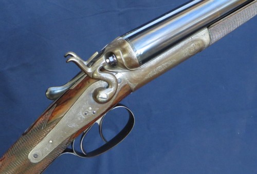 And the last, a beautiful 12b sidelock ejector by John Rigby & Co. Made circa 1887, it has 30 x 2 ½ damascus barrels and stunning 14 Ύ highly figured, replacement wood.