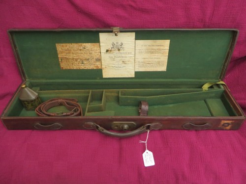 Also a gorgeous 1890 Holland & Holland 1st Type Royal with two sets of barrels, both 30, one 2 ½ Nitro and the other 3 Nitro (1200 bar). Presented in a leather case blocked for both sets of barrels. This is an absolutely delicious example of H&Hs premier model. It features the best level of engraving and with its two sets of barrels can handle everything from soft, 2 ½ x 3/4oz up to the occasional 3 wildfowling load (not Superior Steel).