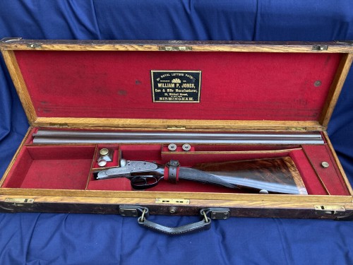 1892 W P Jones of Birmingham 12b SLE, 30” x 2 ½” nitro reproof barrel, highly figured stock, Makers oak & leather case. Notably, it has not only a pair of replacement strikers in their dedicated pot but also a pair of spare mainsprings and spare ejector springs.